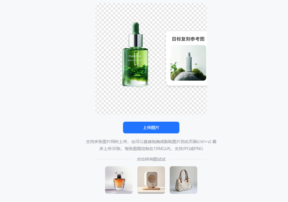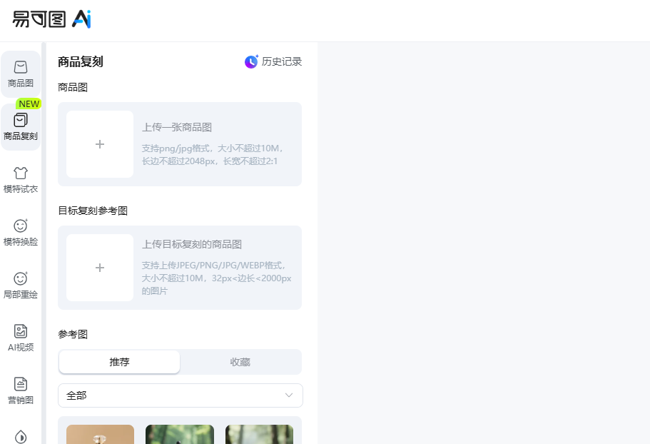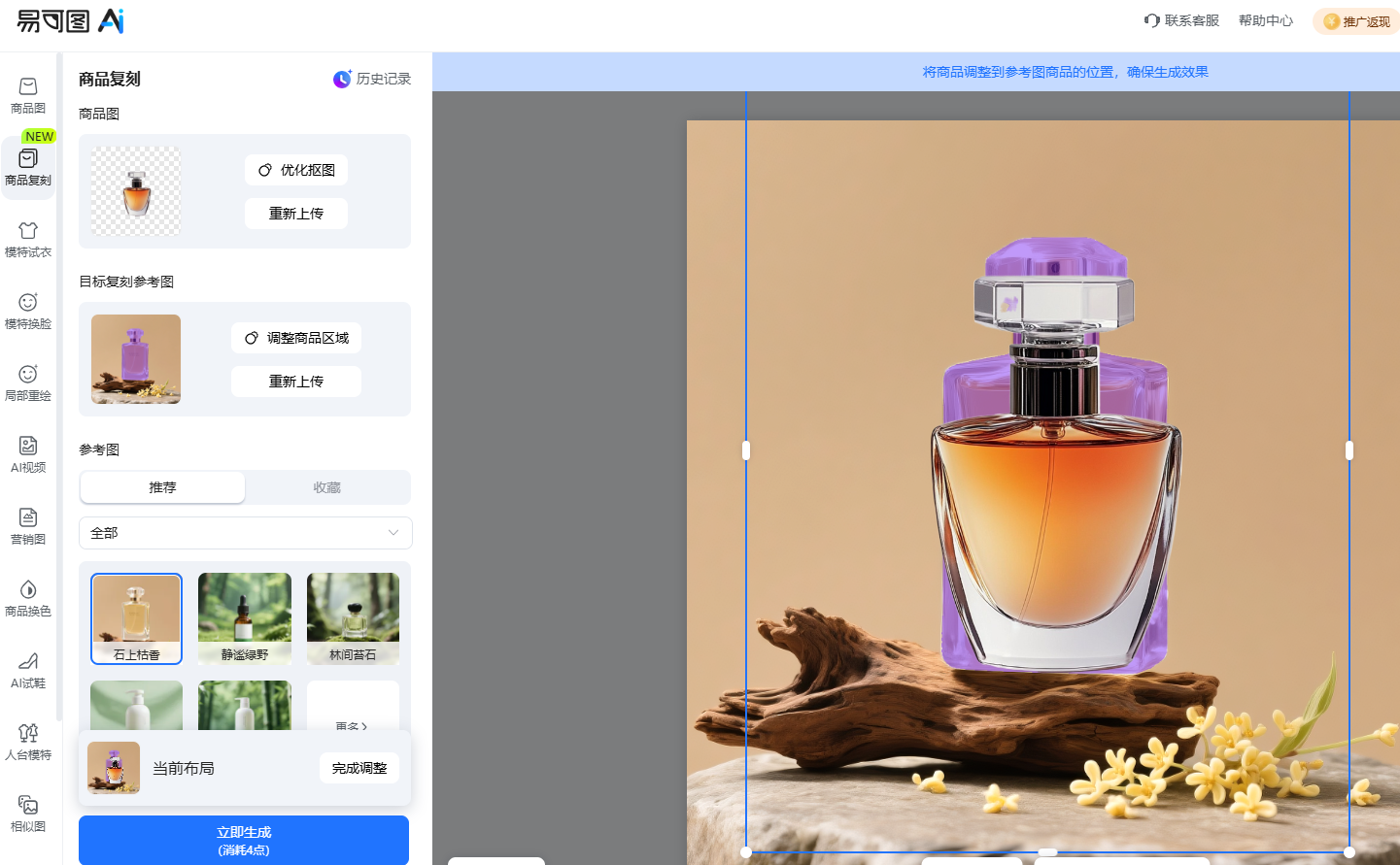 易可图的 “商品复刻” 功能支撑商品原图取方针布景参考图的上传,